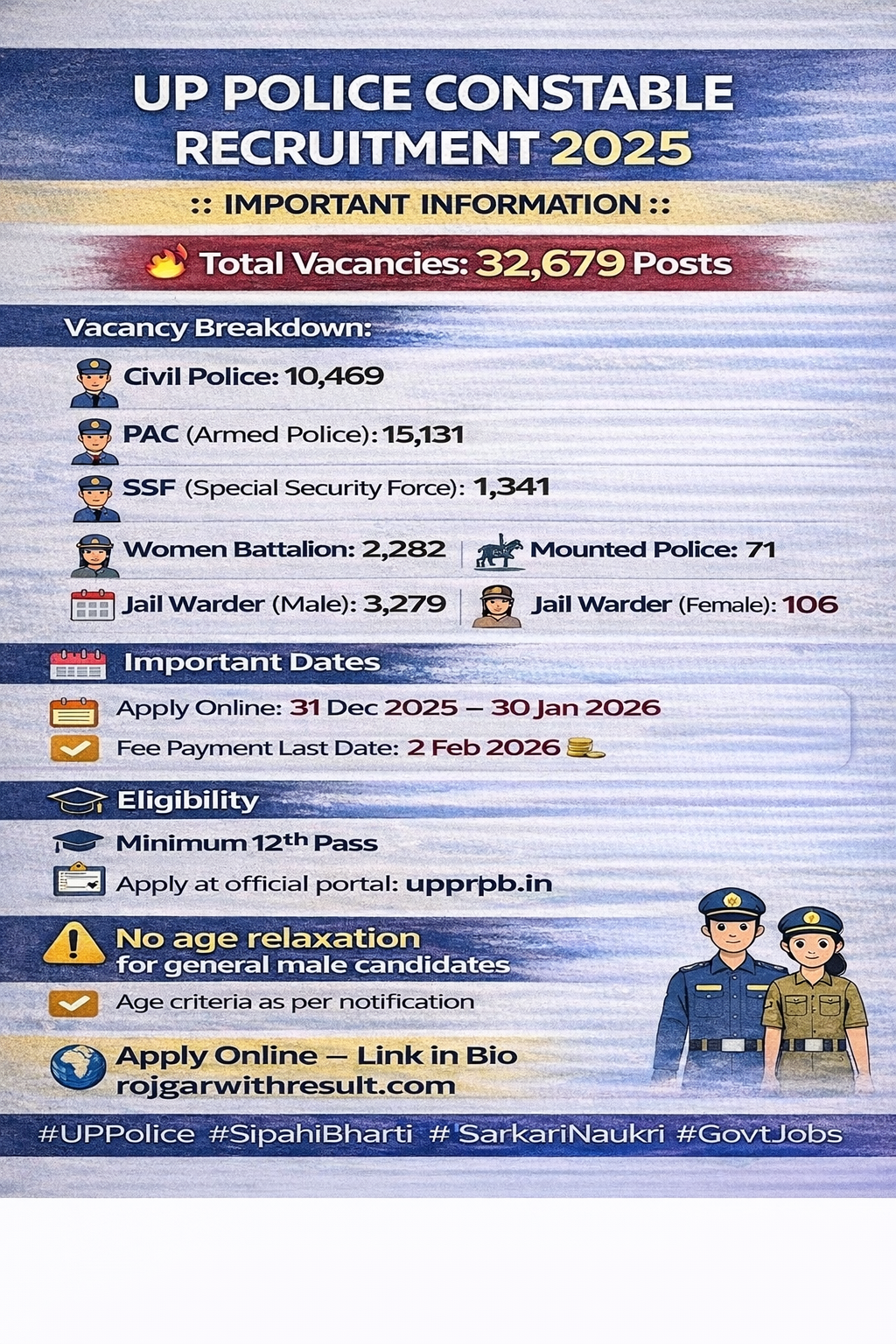 Short Information : Uttar Pradesh Police Recruitment and Promotion Board (UPPRPB) has released the notification for the UP Police Constable Recruitment 2026, with a total of 32,679 vacancies across various divisions within the Uttar Pradesh Police Department. Online applying process for UP Police Constable Recruitment 2026 has started from 31 December 2025 & the candidates can apply till 30 January 2026. Candidates must check the complete details for UP Police Constable Recruitment 2026 which has given below.
